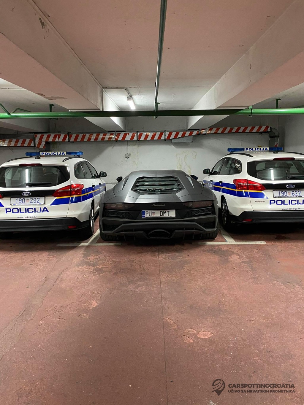 Na našu adresu pristigle su fotografije nesvakidašnjeg prizora iz jedne zagrebačke garaže. Naš je čitatelj, naime, ondje zatekao brutalni Lamborghini Aventador S pulskih registarskih oznaka, a da bi stvar bila interesantnija, dvosjed je snimljen u klinču između dvaju policijskih automobila!